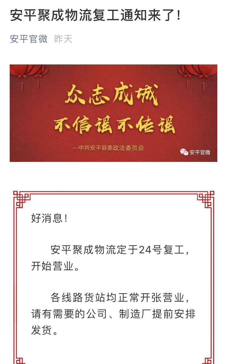 安平聚成物流復工通知來了,鋼纖維24日可正常發貨了!
